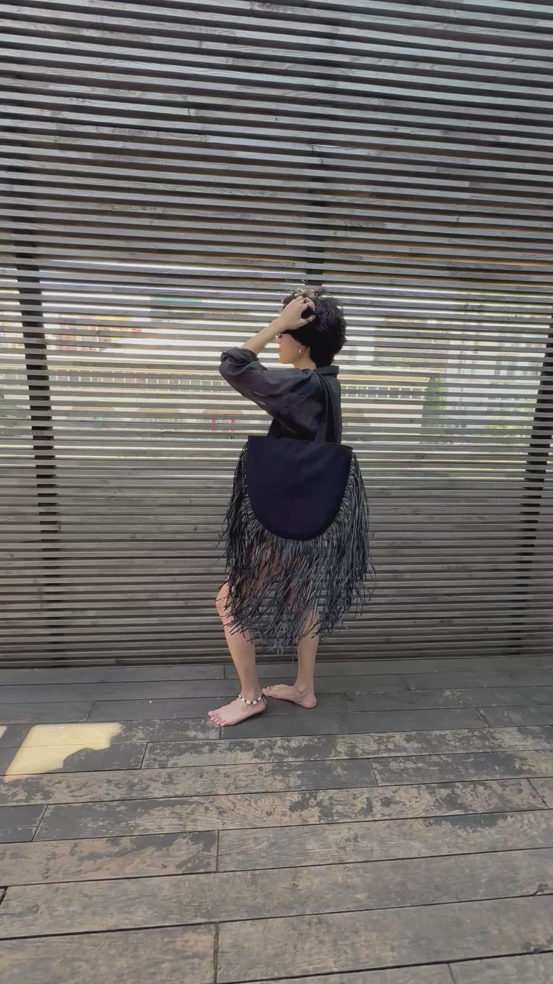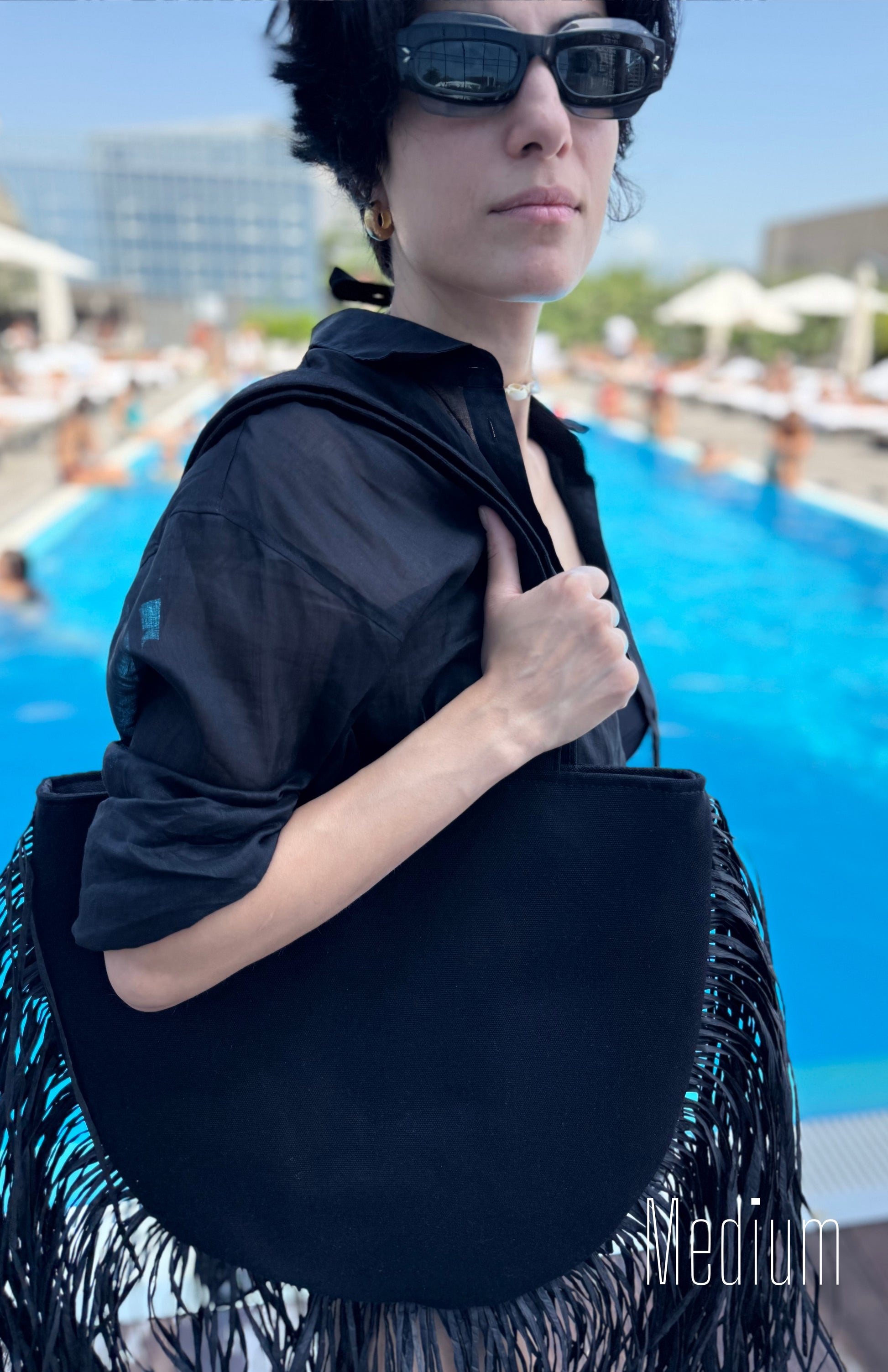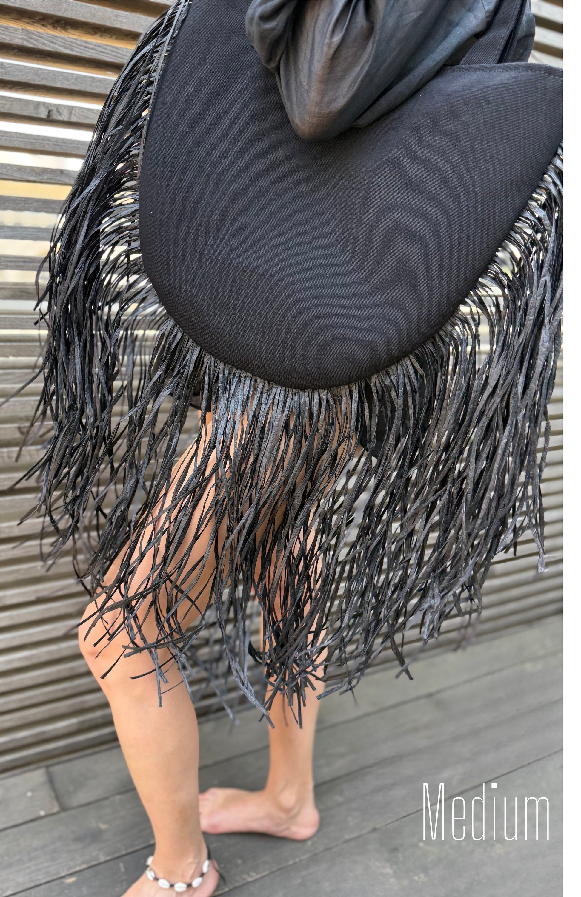 Oval fringe beach bag made of natural fabric with raffia fringe. Lightweight and stylish, perfect for summer outfits, beach days or vacation looks. Handmade and eco-friendly – a must-have summer accessory.