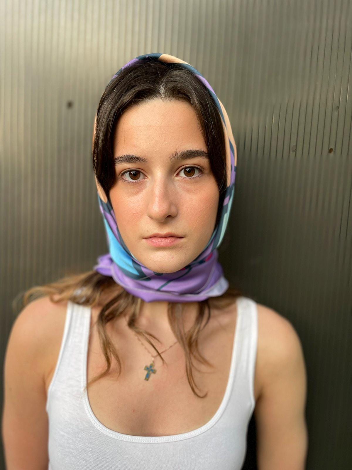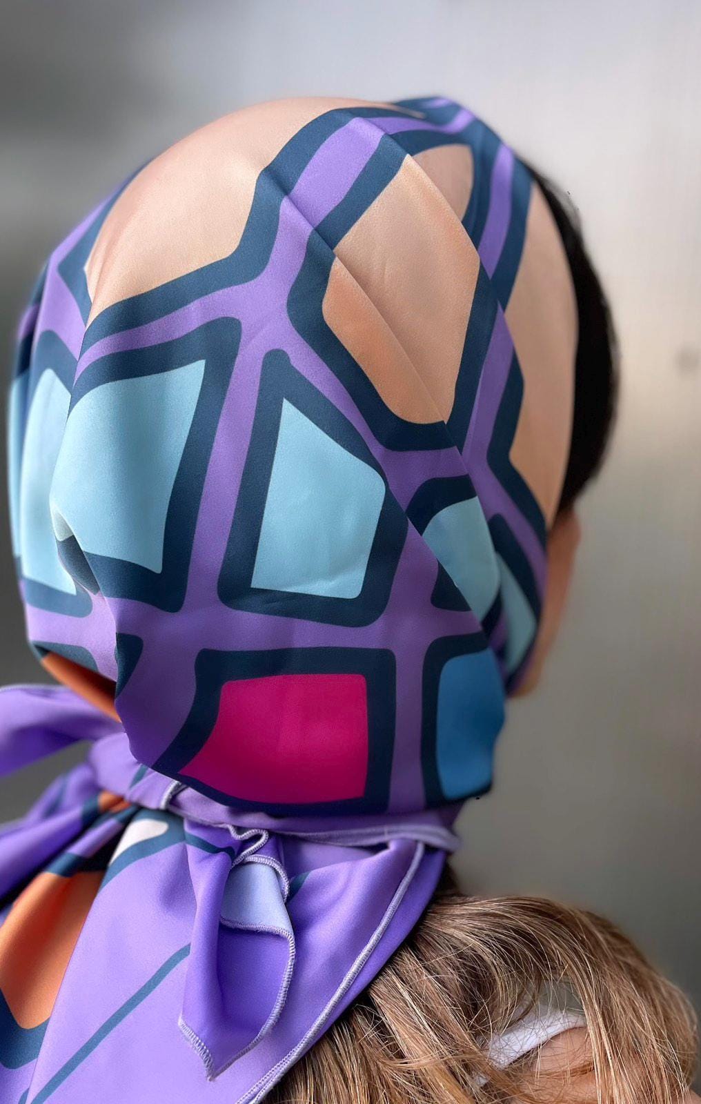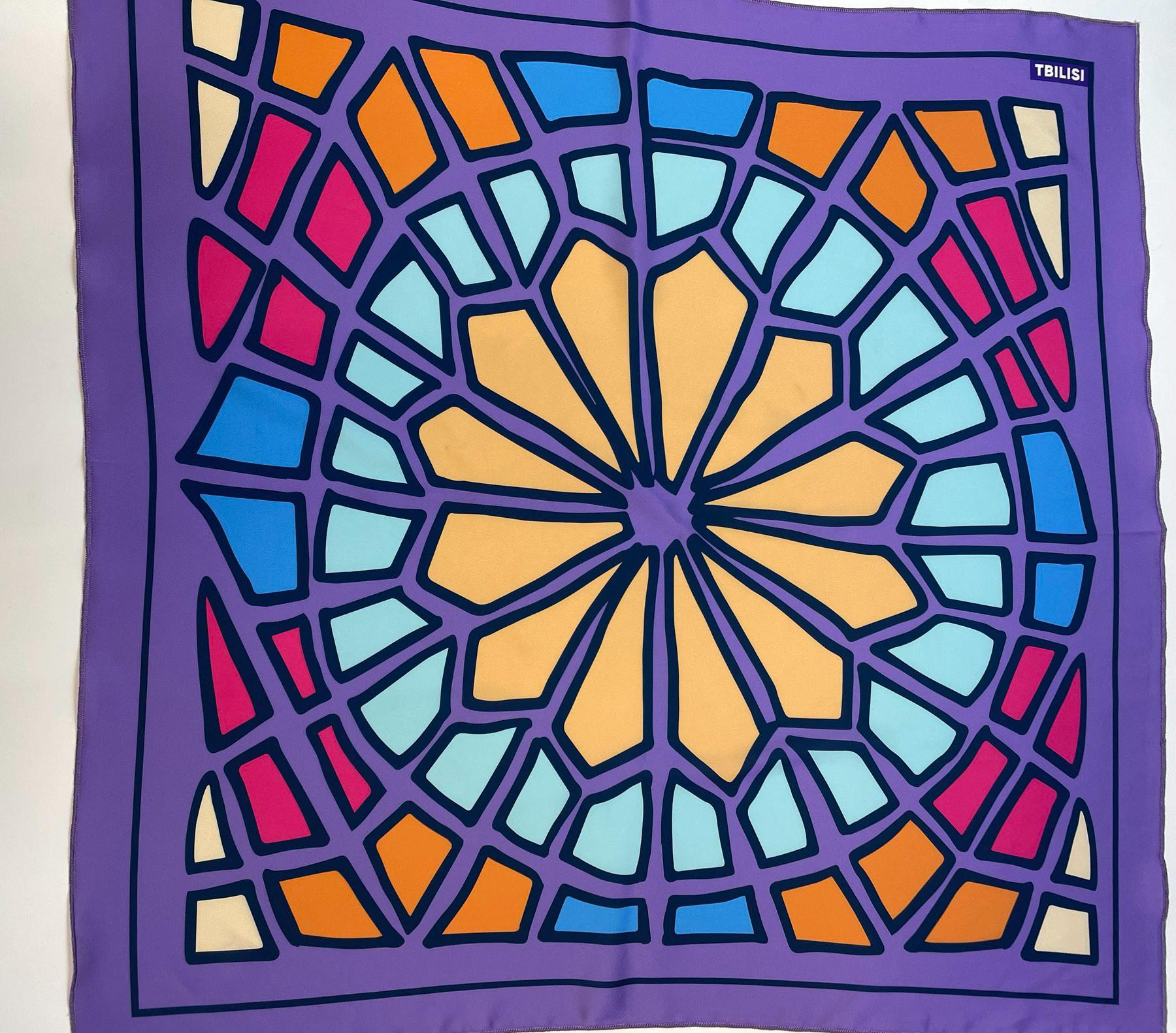 A soft, lightweight scarf made from artificial silk, part of the Tbilisi Souvenirs collection, featuring the architectural ornament of a wooden house on Betlemi Street in Tbilisi, Georgia.